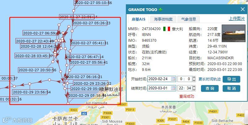 2月26日晚,格里马尔迪的滚装船格兰德多哥号(GRANDE TOGO)抵达摩洛哥卡萨布兰卡锚地,2月24日,该轮从意大利热那亚出发抵达于此。该船没有抛锚,从26日晚直到世界时间2月28日17时,它一直在卡萨布兰卡和卡萨布兰卡安克雷奇(Casablanca Anchorage)附近航行。滚装码头似乎是空的没有拥堵排队,没有停靠的滚装船或汽车运载工具。这是什么情况?对冠状病毒的恐惧是最有可能的答案。如果其在等一些货物或其他货物,为什么不抛锚而四处游弋,燃烧昂贵的燃料和磨损装置?意大利现在是热点地区,难道格兰德多哥号(GRANDE TOGO)被隔离了?具体原因不详,不过该轮29日终于得以靠港。目前已离开卡萨布兰卡。