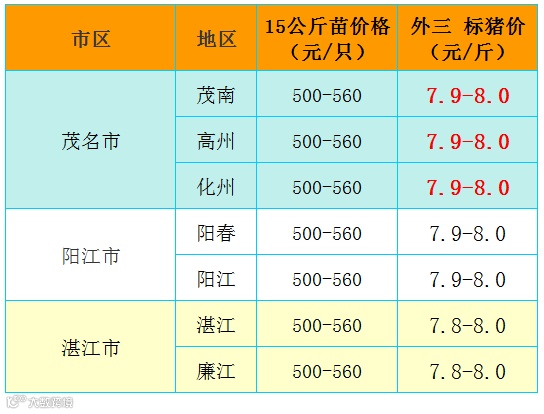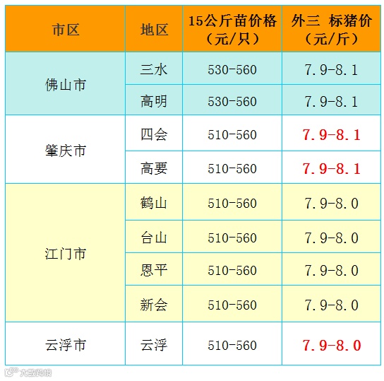 有红绿颜色部分是相对昨天有所变动的猪价;