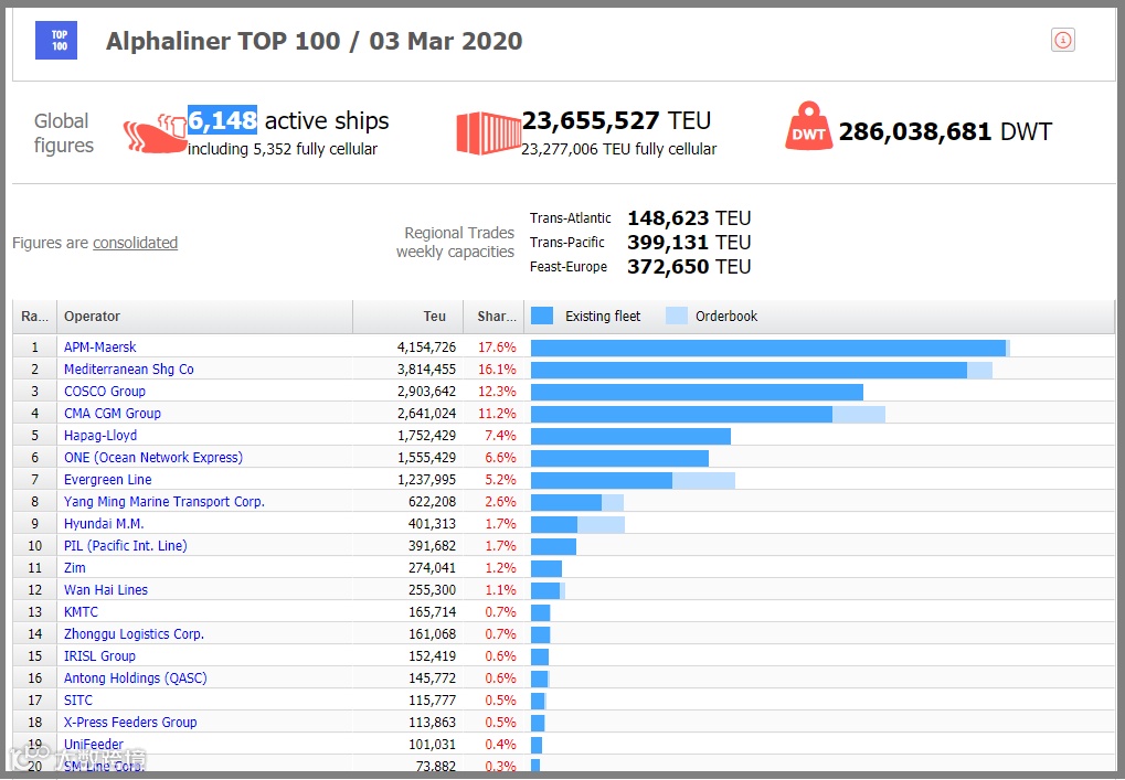 Alphaliner数据显示,截至2020年3月3日,全球集装箱船总运力为23,655,527TEU,运营的集装箱船总数为6148艘。