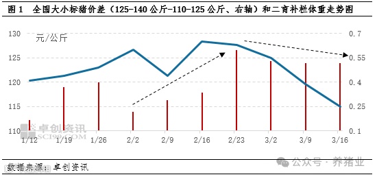 【导语】春节后,市场二次育肥补栏体重基准先扩大后收窄,二育补栏体重需求差异带动大小标猪价差跟随调整。而3月下旬预期全国气温回升,叠加持续性增重现实压力,预计短期肥标价差或小幅收窄。