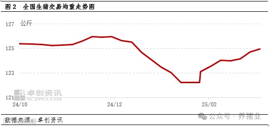 2025年2-3月,二次育肥补栏呈现体量以及体重基准先提升后下降走势。根据卓创资讯监测数据,截至2025年2月23日,全国生猪二次育肥交易周均重为126.53公斤,周内部分时段高于130公斤,该周大小标猪价差均值为0.63公斤,亦来到较高水平。南方大猪销区市场受天气影响,需求端有持续支撑,叠加节前养殖端降重超卖,节后大猪供应紧张,市场150公斤以上大猪分级价差明显,呈现“越大、越肥、越贵”的特点。因此,市场二育热度升高,多数补栏125-140公斤标猪进行二次育肥,倾向短频快操作降低压栏周期过长风险,因此该时段125-140公斤的大标猪行情高于110-125公斤且逐步拉大差距。而进入3月,经过一个月压栏周期以及气温逐步回升影响,供需两端共同利空中猪行情(280-300公斤),市场二育补栏体重基准降低,逐步下移至110-125公斤体重,该体重段猪源价格有所提升,和125-140公斤猪源逐步收窄,截至3月16日,两者价差为0.25元/公斤。