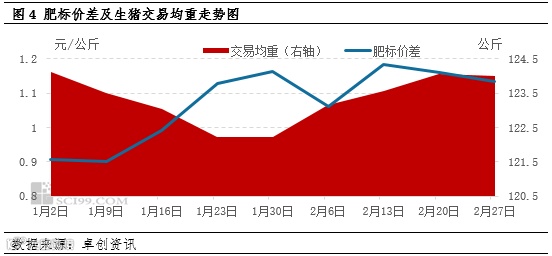 自1月份开始,生猪肥标价差扩大,春节过后依然居高不下,因此大体重生猪利润更为丰厚,带动养殖端压栏增重。根据卓创资讯监测,2月13日全国肥标价差涨至最高位,为1.19元/公斤。生猪交易均重亦从节前的122.23公斤涨至2月下旬的124.05公斤,涨幅1.49%。