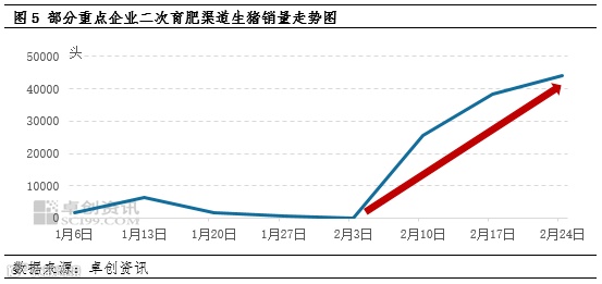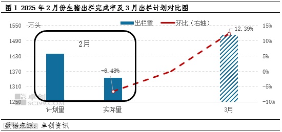 根据卓创资讯统计,2月份样本企业生猪实际出栏量与计划量相比下降6.48%,换言之,2月份生猪出栏计划完成率为93.52%,企业并未完成2月份生猪出栏计划。因此,部分生猪出栏计划将挪至3月份完成。同时,2月份为春节后生猪出栏量由少到多、逐步恢复至正常水平的月份,其出栏量亦较为有限,3月份整体生猪出栏量或好于2月水平。卓创资讯监测3月份生猪出栏计划或环比增加12.39%,生猪供应量增加,对行情有利空影响。
