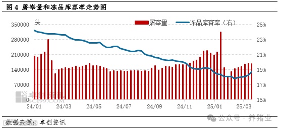 3月份,居民家庭库存逐渐消化,同时院校开学后对猪肉的需求相对集中和稳定,支撑屠宰企业订单增加。截至25日,卓创资讯监测3月份样本企业生猪屠宰量为16.22万头,环比增加20.73%,月内呈震荡增加走势,养殖端头均成本降低,有利于屠宰毛利增加。但是,卓创资讯监测3月份毛白价差为4.09元/公斤,环比收窄0.27元/公斤,代表屠宰企业盈利空间缩小,支撑3月份屠宰企业毛利下滑。同时,根据卓创资讯调研,白条市场走货不畅,屠宰企业宰杀后的白条并未销售完毕,多存在被动入库的情况。3月份卓创资讯监测冻品库容率呈上升走势,截至20日,屠宰企业冻品库容率为18.72%,较月初增加0.63个百分点,同样支撑屠宰毛利下滑。(毛白价差=白条价格-生猪价格)