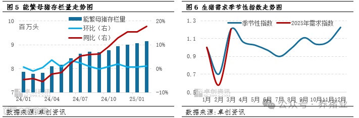 从生猪供应来看,一季度市场存在部分二次育肥行为,打乱原本供应节奏,部分生猪或延后至二季度出栏。同时,2024年6-8月的能繁母猪存栏量可推出2025年二季度的生猪理论出栏量,2024年6-8月卓创资讯监测样本企业能繁母猪存栏量累计增加6.72%,代表二季度生猪出栏量或陆续增加,养殖端供应压力或较大。从生猪需求来看,卓创资讯根据过去五年屠宰量计算的生猪需求季节性指数,二季度终端消费或继续恢复,白条市场走货或有好转,屠宰企业屠宰量或增加,但随气温升高、院校放假,二季度末屠宰量或减少。