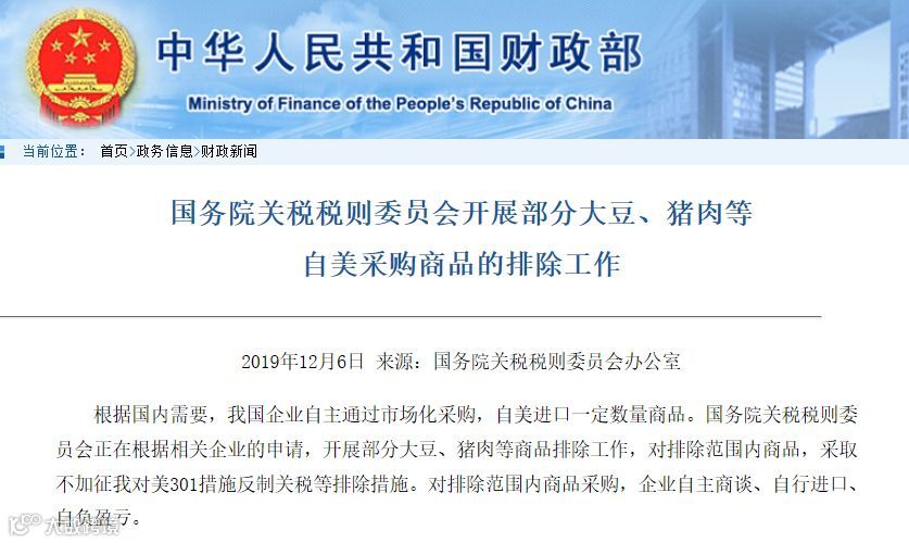 12月6日,国务院关税税则委员会办公室发布公告称,正在根据相关企业的申请,开展部分大豆、猪肉等商品排除工作。