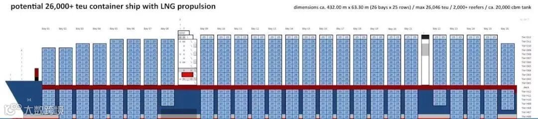 沪东中华介绍到,这款箱船全长432.5米,船宽63.6米,型深33.7米,配备12个货舱,最大堆箱数达25600TEU。其最大亮点是使用沪东中华自主研发的B型LNG燃料舱,舱容达20000立方米。B型液舱是独立自持式围护系统,可与船体平行同步建造,能大幅缩短建造周期,B型液舱里可单独设置止荡舱壁,相比薄膜型围护系统在满足任意液位装载要求方面对几何尺度没有限制,能最大化利用船体空间,是高性价比的大容量LNG燃料储存解决方案。