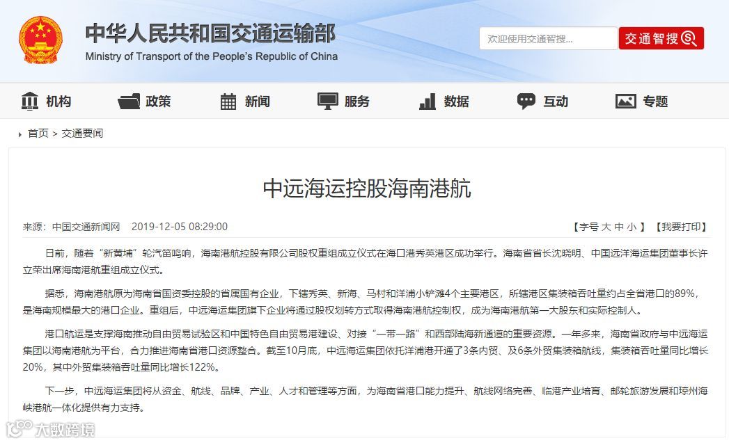 中远海运集团旗下企业将通过股权划转方式取得海南港航控制权,成为海南港航第一大股东和实际控制人。