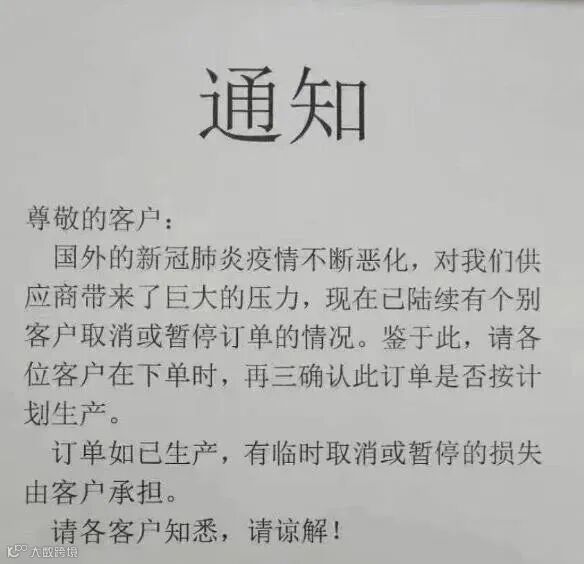 目前受疫情影响,已有客户出现取消或暂停订单的情况,为此,某工厂已经向下单客户发出通知,如下: