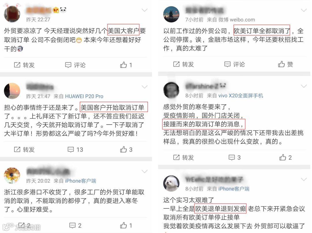 短短两周,中国外贸行业历经反转。近日,多地外贸厂商反映,由于欧美地区疫情形势变化迅速,消费预期收缩,品牌纷纷取消或收缩外贸订单规模,使得刚刚复工的外贸行业再次陷入冰点。外贸企业倍感无助的表示:“欧洲市场全面歇火”、“行情很不好,全世界感觉要瘫痪了”、“整体可能比08年还严重”。
