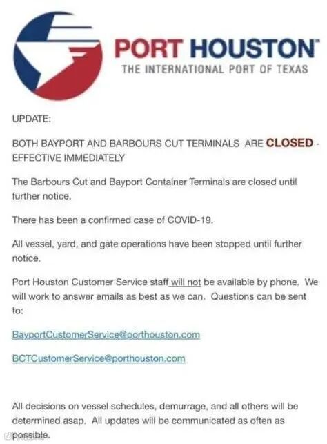 休斯敦港务局表示,旗下Barbours Cut和Bayport两个集装箱码头,有工作人员在COVID-19冠状病毒检测中呈阳性。鉴于上述信息,在进行大量调查的同时,出于谨慎考虑,两个集装箱码头宣布暂时关闭,休斯敦港的航道正常开放,200多个私人码头依然正常运行。