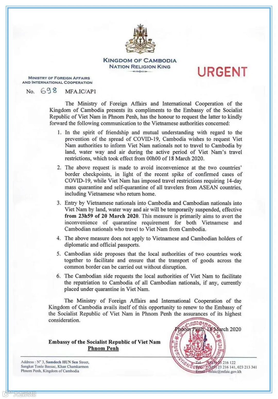 柬埔寨总理洪森对越南人民感到惋惜,他认为进入越南的柬埔寨人很少,越南人来柬埔寨的更多。此前,洪森已下令禁止意大利、德国、西班牙、法国和美国等欧美5国及伊朗人员入境,如今越南成为禁令名单上的第7个国家。
