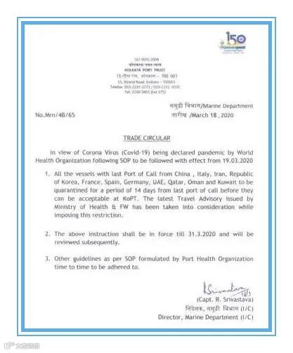 印度加尔各答港(Kolkata port)相关部门发布最新防疫指示,所有上一站停靠港为中国、意大利、伊朗、韩国、法国、西班牙、德国、阿联酋、卡塔尔、阿曼和科威特的船只,必须接受为期14天的隔离检疫(从离开最后靠泊港开始计算)后,才可以停靠加尔各答港进行作业。这一指示措施有效期至2020年3月31日,并在随后进行审核考量。