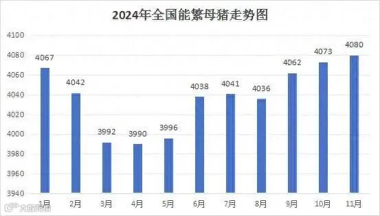 根据国家五部委发布2024年11月生猪数据显示,2024年11月末,全国能繁母猪存栏量4080万头,比上个月增加7万头,环比上涨0.2%,成为近11个月以来的最高存栏量。这一数据不仅表明生猪产能正在逐步恢复,也预示着未来生猪市场的供应压力将进一步加大。
