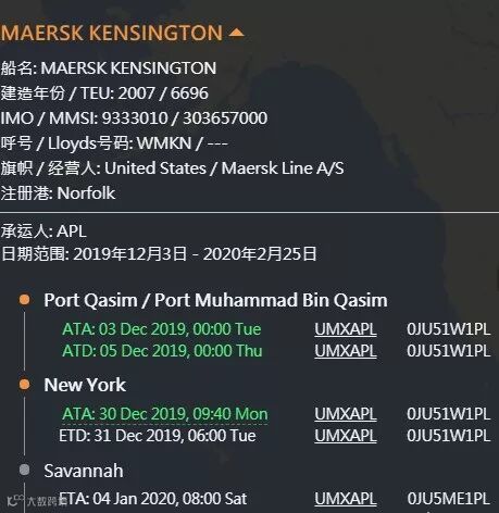 MAERSK KENSINGTON轮是一艘往返于Savannah的大西洋航线,包括汉堡南美、APL、马士基等多家船公司共舱。