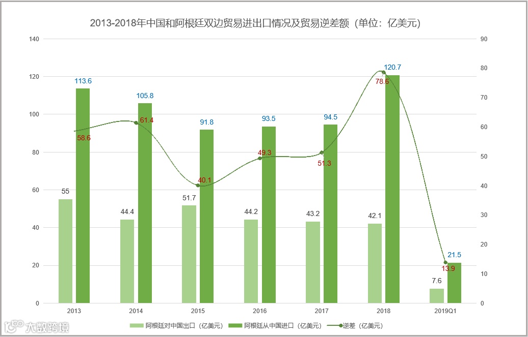 据阿根廷统计局统计数据来看,2013-2018年阿根廷从中方的进口额都大于出口额,阿根廷处于贸易逆差状态,并且中国是阿根廷最大的贸易逆差来源国;2018年阿根廷从中国进口额达到历史峰值,120.7亿美元;逆差额也达到历史最高值,约78.6亿美元。