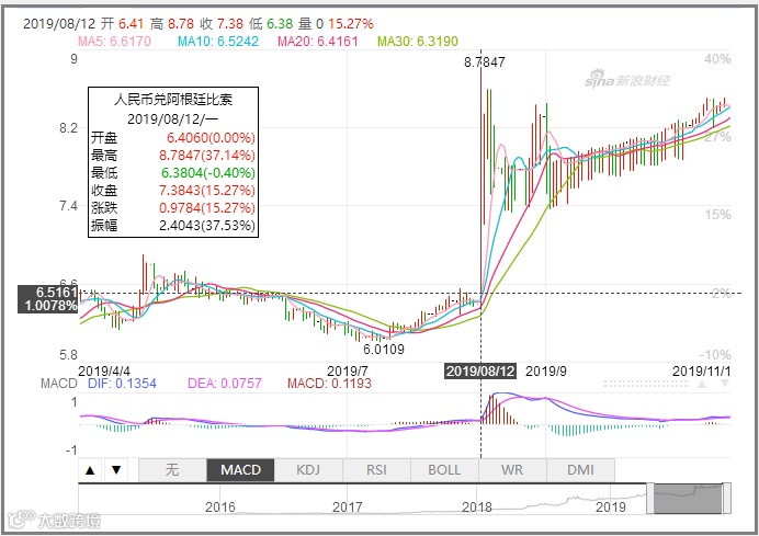 在总统初选结果公布的第二天8月12日,阿根廷比索兑美元一度跌约36%,达到61.99比索,刷新了盘中历史低点。人民币兑阿根廷比索汇率则涨至7.3885比索,年内升值35%。
