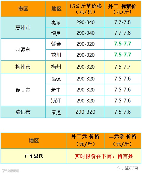 有红绿颜色部分是相对昨天有所变动的猪价;