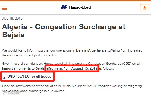 鉴于上述情况,从2019年8月15日起,Hapag-Lloyd将对所有运往阿尔及利亚的贝贾亚(Bejaia)港的进口货物征收拥堵附加费(CGD),具体措施如下: