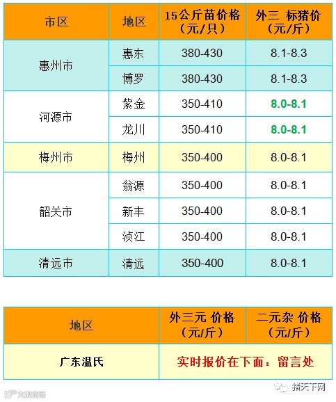 有红绿颜色部分是相对昨天有所变动的猪价;