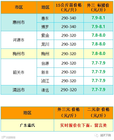 有红绿颜色部分是相对昨天有所变动的猪价;