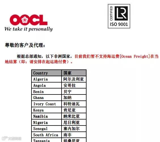 船公司东方海外近日发出紧急通知,包括阿尔及利亚、安哥拉、贝宁、加纳、科特迪瓦、肯尼亚、纳米比亚、尼日利亚、塞内加尔、南非、坦桑尼亚、多哥在内的非洲国家,暂不支持海运费在当地结算,需要在起运港预付!