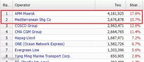 马士基航运全球老大的地位可能不稳了。加上最新订造的5艘23000TEU超大型集装箱船之后,地中海航运有望在未来两年内取代马士基航运成为全球最大的集装箱船航运公司。