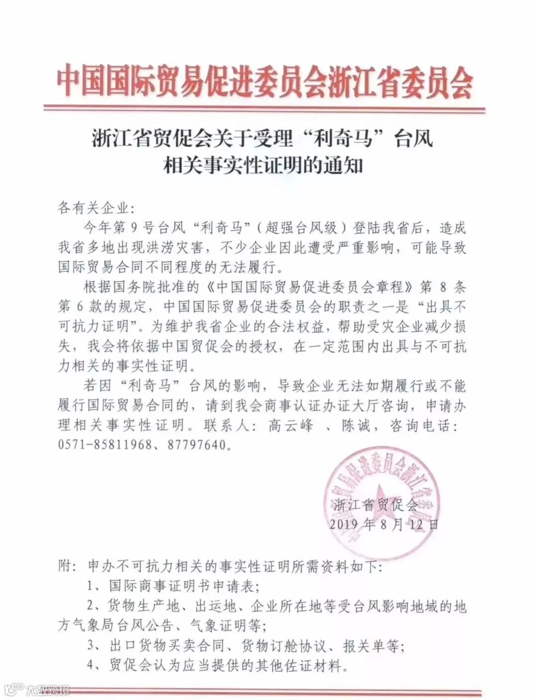 浙江省贸促会12号发布通知,推出与“利奇马台风”相关的事实性证明(比如因为台风推迟交货期等),尽最大努力帮助受灾企业减免违约责任。