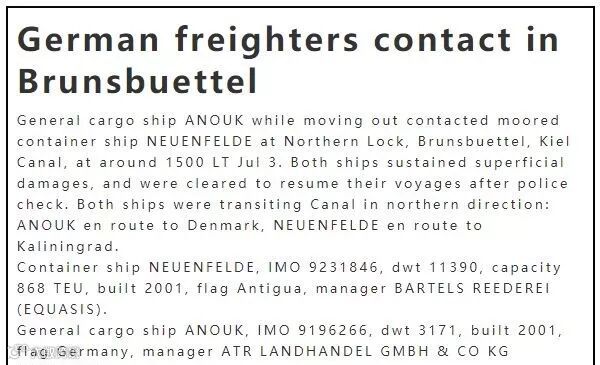 当地时间7月3日下午3点左右,一艘满载货物从德国汉堡出发的集装箱船NEUENFELDE,在Brunsbuettel基尔运河与一艘普通货船ANOUK发生碰撞,两船都受到了损害。