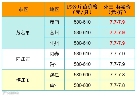 有红绿颜色部分是相对昨天有所变动的猪价;
