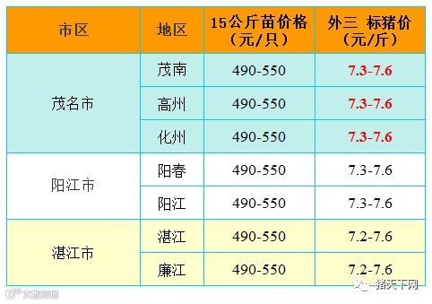 有红绿颜色部分是相对昨天有所变动的猪价;