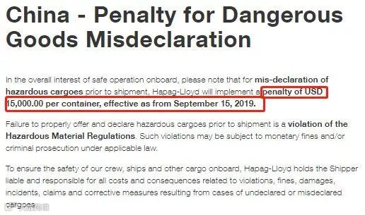 赫伯罗特表示,将从9月15日起,针对转运前错误提报危险品信息,将收取15000美元/箱的罚款。