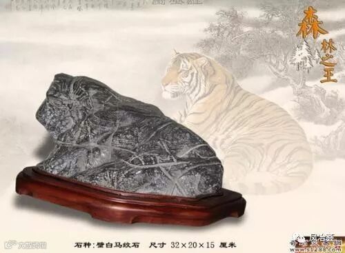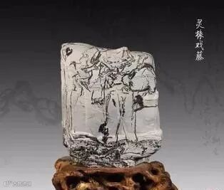 灵璧透花石:颜色黑、灰,表面有人物、植物、山川、清溪、汉画等图案,有较强墨韵感。