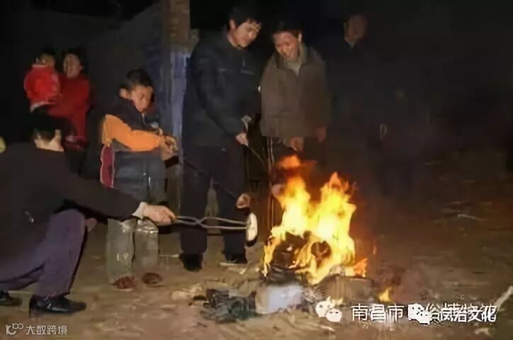 80年代之前,家家门口烤火,纯用柏树枝叶烧,满街飘着清香,村村炮声不绝。小孩们提前几天,方圆几十里内找柏树枝叶。后来嘛,实在是没有柏树了,现在都烧柴火拉倒。烧至尾声时,倒入五谷杂粮,据说,第二天大清早来看,灰里剩什么粮食,即该年此作物将丰收。实际好多人不作此项目,有倒五谷者,其实第二天也并不看,科学普及了嘛,没人信这个,可风俗是这样,就有这样做的。