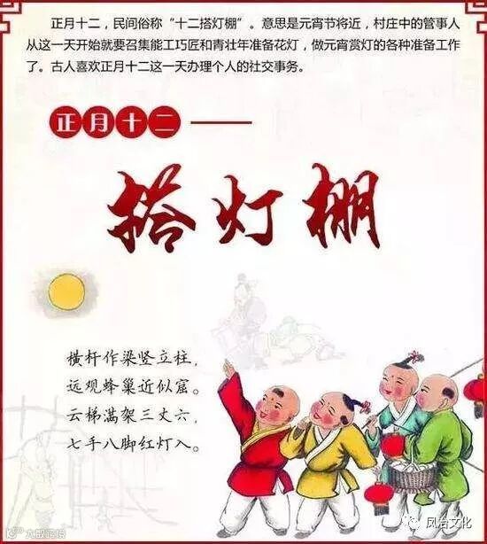 从即日起人们开始准备庆祝元宵佳节,选购灯笼,搭盖灯棚。有童谣云:“十一嚷喳喳,十二搭灯棚,十三人开灯,十四灯正明,十五行月半,十六人完灯。”