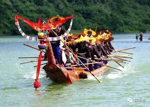 鼓头是龙舟上的指挥,是全寨推选出来最有威望的人。一个十来岁的孩子担任打锣手,水手共三十八名,由寨子里剽悍青年担任。比赛中水手每人手持一支一手掌宽,约一米五长的扁担形木桨。身披蓑衣,头载斗笠,以示祈雨。
