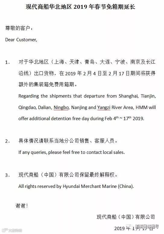 HMM关于2019年春节免箱期延长通知