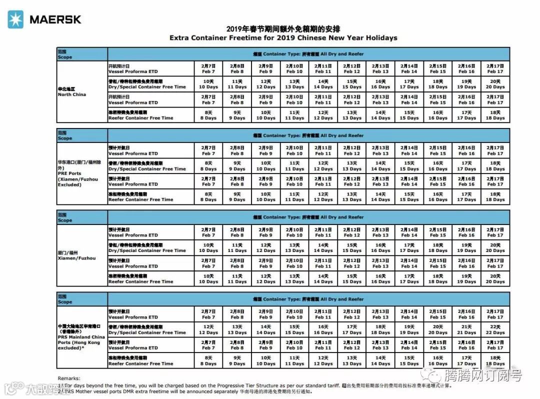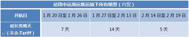 注:所有在1月20日-2月19日期间从中国大陆地区出运的出口订舱(内贸)货物,都将享有上述额外延长出口免箱期(不含堆存及冷插费用),并且不会产生额外的滞期费用