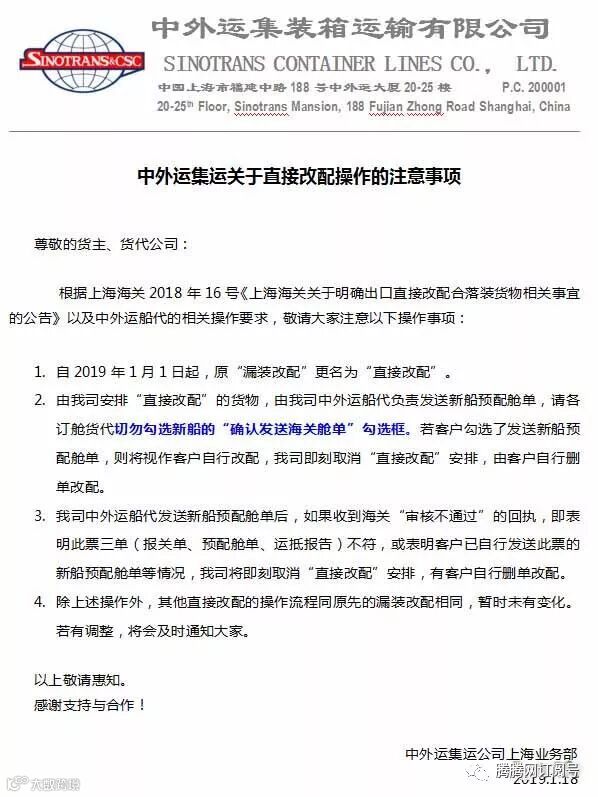 尊敬的货主、货代公司:根据上海海关2018年16号《上海海关关于明确出口直接改配合落装货物相关事宜的公告》以及中外运船代的相关操作要求,敬请大家注意以下操作事项: