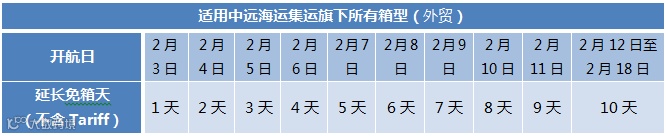 注:所有在2月3日-2月18日期间从中国大陆地区出运的出口订舱(外贸)货物,都将享有上述额外延长出口免箱期(不含堆存及冷插费用),并且不会产生额外的滞箱费用