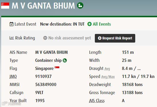 “GANTA BHUM”号是一艘服务于科伦坡港(COLOMBO)-杜蒂戈林港(TUTICORIN)支线集装箱船舶,运力1128TEU,该轮原定于17日抵达杜蒂戈林港,由于此次事故,截止目前该轮仍锚泊在科伦坡港。有货物在科伦坡港中转的外贸和货代要注意了,请广大航贸朋友关注船公司通知及时确认货物延期情况。