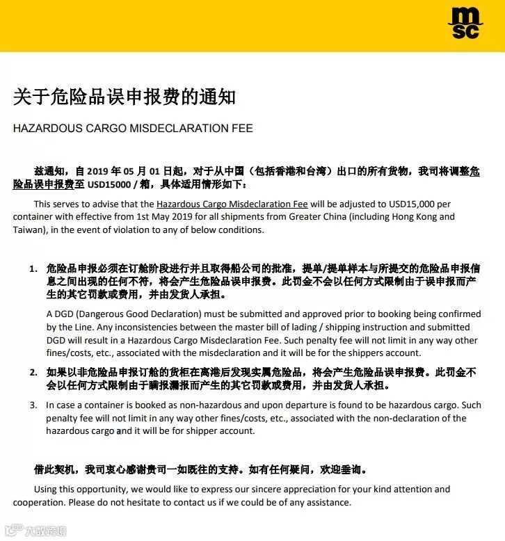 近日,MSC地中海航运发布通知:自2019年05月01日起,对于从中国(包括香港和台湾)出口的所有货物,我司将调整危险品误申报费至USD15000 / 箱,具体适用情形如下: