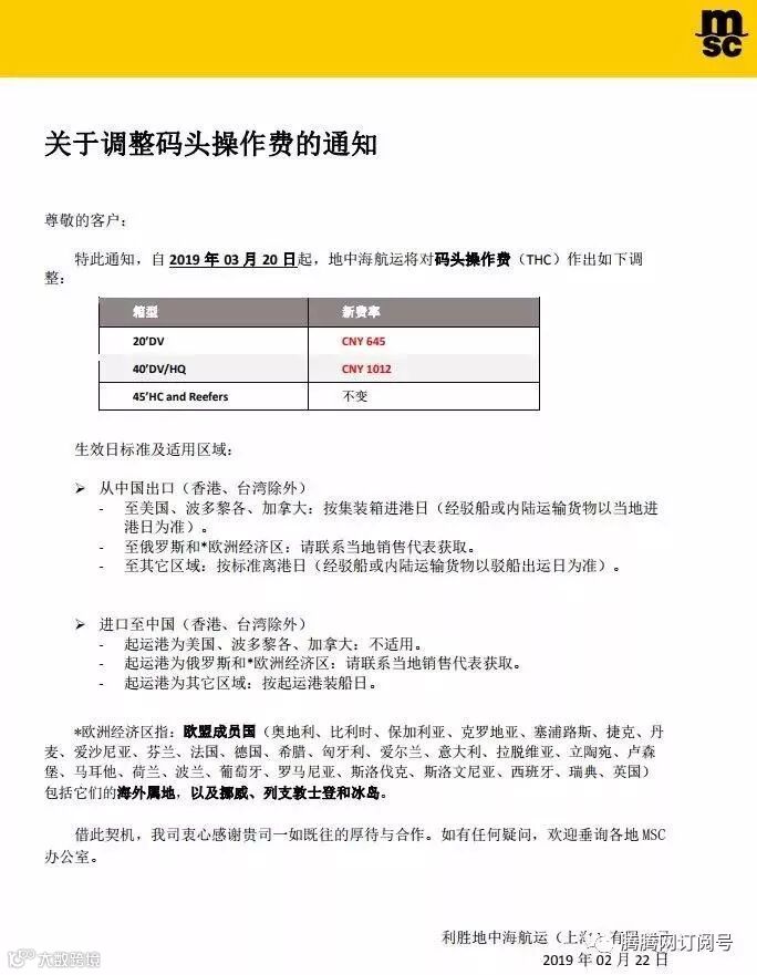 特此通知,自2019年03月20日起,地中海航运将对码头操作费(THC)作出如下调整: