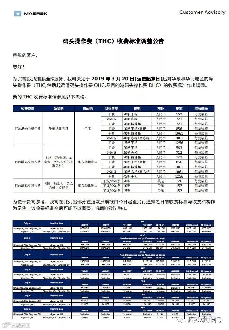 MSK码头操作费(THC)收费标准调整公告