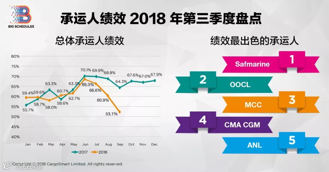 在刚刚过去的第三季度,根据大船期发布的分析船期可靠性,2018年第三季度船期可靠性大幅下滑低于2017年同期绩效。