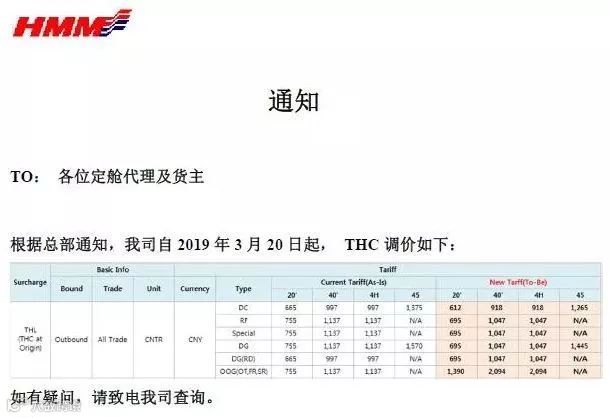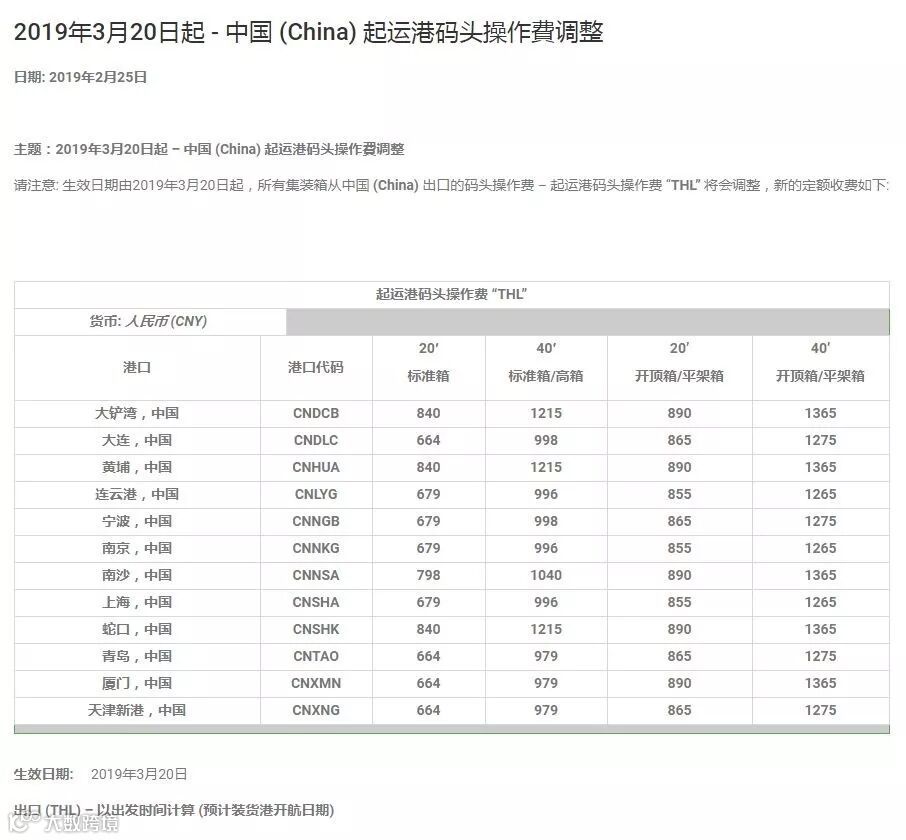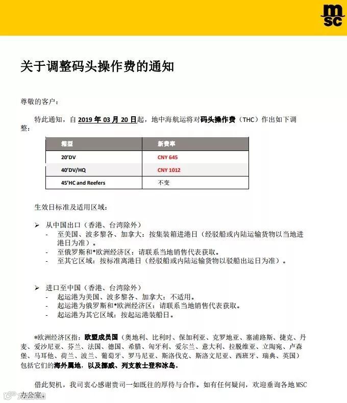 特此通知,自2019年03月20日起,地中海航运将对码头操作费(THC)作出如下调整: