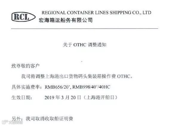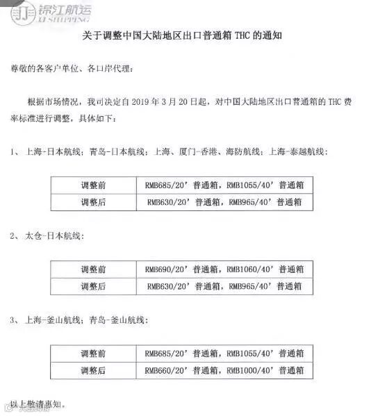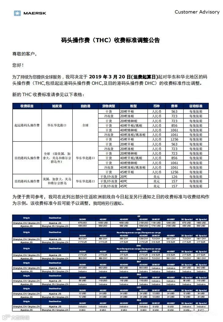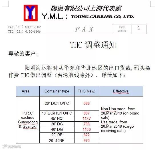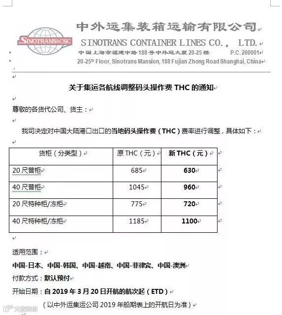 为了持续为您提供全球服务,我司决定于2019年3月20日(运费起算日)起对华东和华北地区的码头操作费(THC,包括起运港码头操作费 OHC,及目的港码头操作费 DHC)的收费标准作出调整。