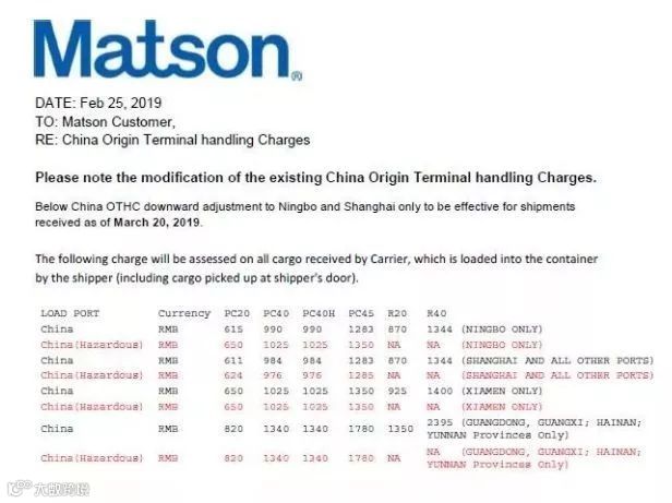 继马士基、地中海航运之后,YML、HMM、SNL、ESL、SJJ、RCL、Matson等船公司也于近日通知客户,调整码头操作费THC。