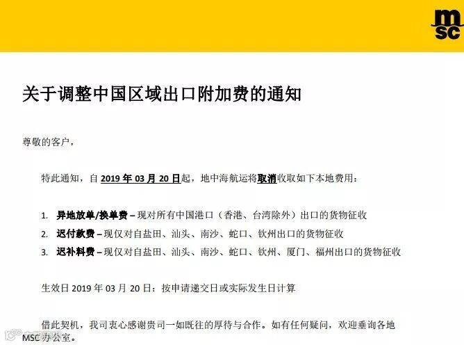 特此通知,自2019年03月20日起,地中海航运将取消收取如下本地费用: