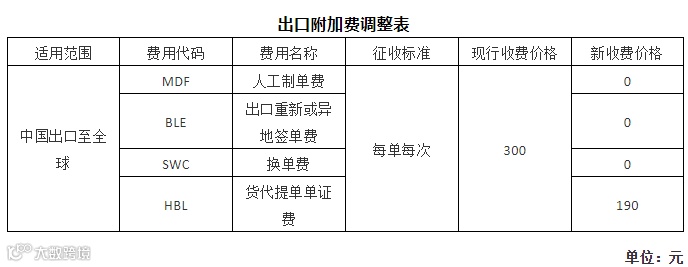 其中,前三项费用由原来的每单每次300元降至0元,这意味着这部分费用将不再收取。同时,货代提单单证费,也由每单每次300元,大幅下降至190元。
